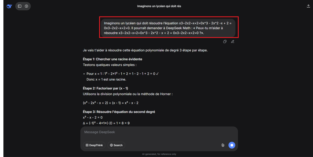 Imaginons un lycéen qui doit résoudre l’équation x3−2×2−x+2=0x^3 – 2x^2 -x + 2 = 0x3−2×2−x+2=0. Il pourrait demander à DeepSeek Math : « Peux-tu m’aider à résoudre x3−2×2−x+2=0x^3 – 2x^2 – x + 2 = 0x3−2×2−x+2=0 ?».