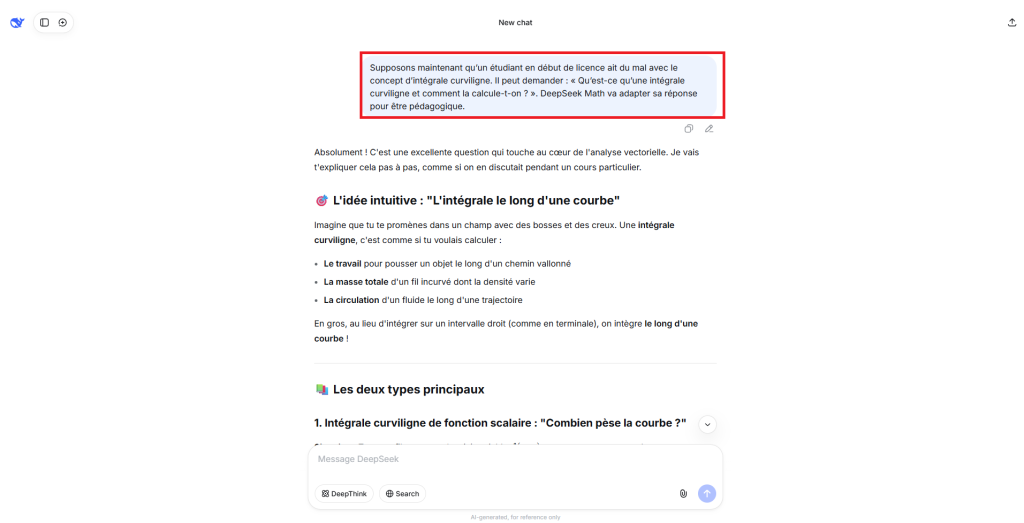 Supposons maintenant qu’un étudiant en début de licence ait du mal avec le concept d’intégrale curviligne. Il peut demander : « Qu’est-ce qu’une intégrale curviligne et comment la calcule-t-on ? ». DeepSeek Math va adapter sa réponse pour être pédagogique.